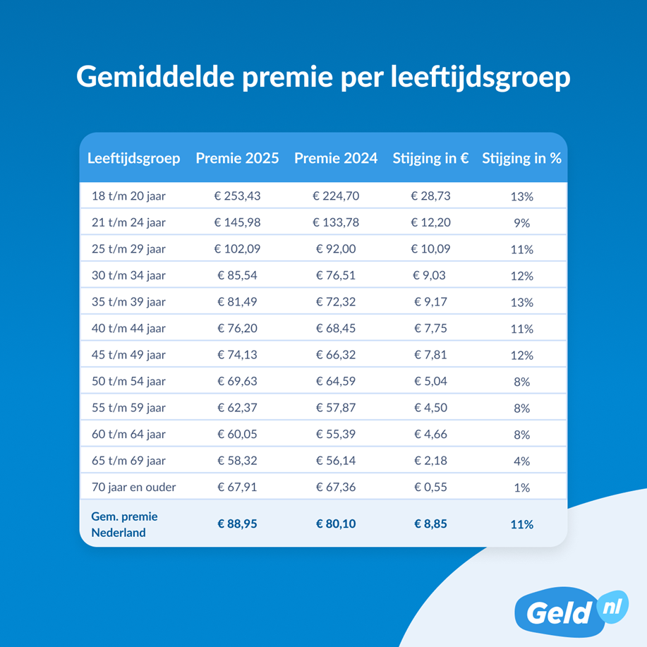 De premies voor autoverzekeringen stijgen al sinds 2022, blijkt uit onderzoek van Geld.nl. Oorzaken van de stijging zijn onder andere een toenemende schadelast, inflatie en hogere loonkosten. Als gevolg hiervan steeg de gemiddelde premie voor een autoverzekering in de eerste helft van 2025 opnieuw, met 11% ten opzichte van 2024. Autobezitters betalen nu gemiddeld een kleine € 89 per maand aan premie voor hun autoverzekering, in 2024 lag deze gemiddeld nog op € 80. Met name jonge bestuurders en 30-plussers zijn fors meer gaan betalen. Zij kregen te maken met een premiestijging van gemiddeld 13%.