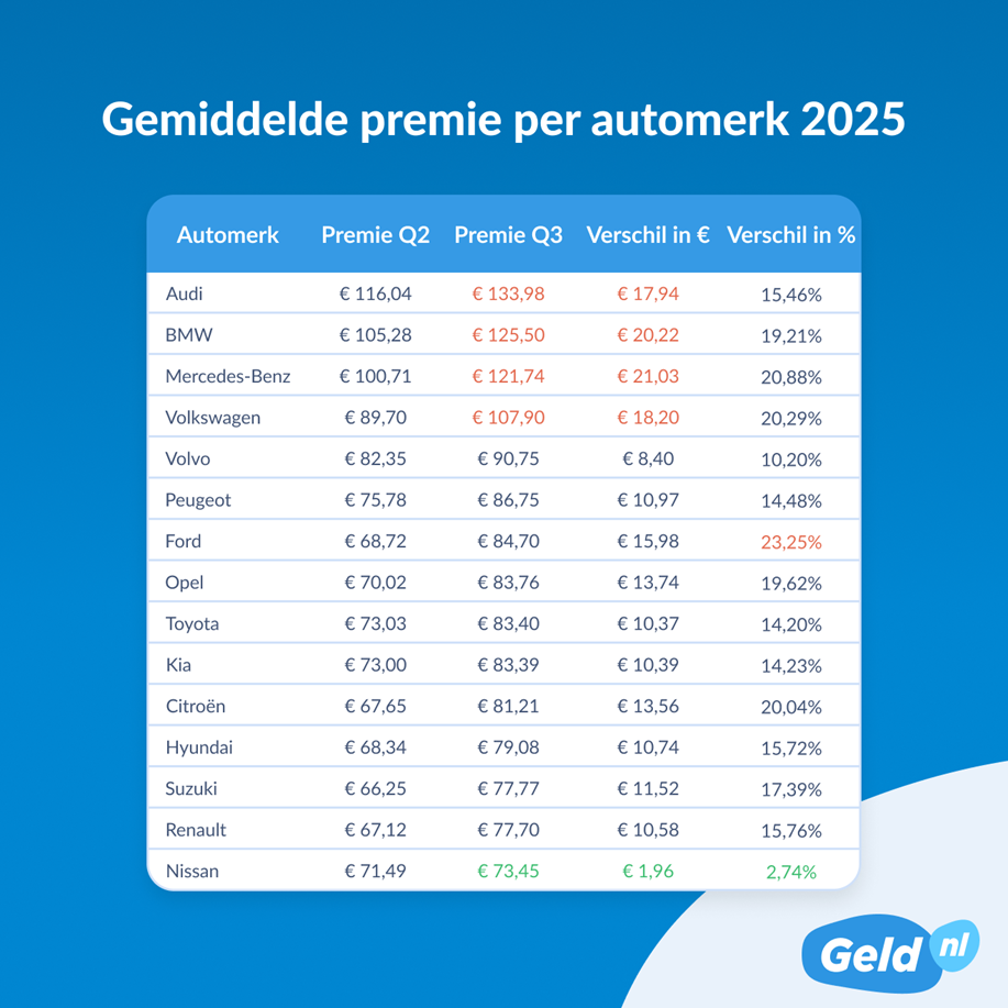 De premies voor de 15 meest vergeleken autoverzekeringen zijn in het derde kwartaal van 2025 met gemiddeld 16% gestegen. Dat stelt financiële vergelijkingssite Geld.nl op basis van onderzoek naar de 15 populairste automerken. Bezitters van een Audi zijn het duurst uit voor het verzekeren van hun bolide. Nissan-rijders hebben het minst last van een stijgende premie.