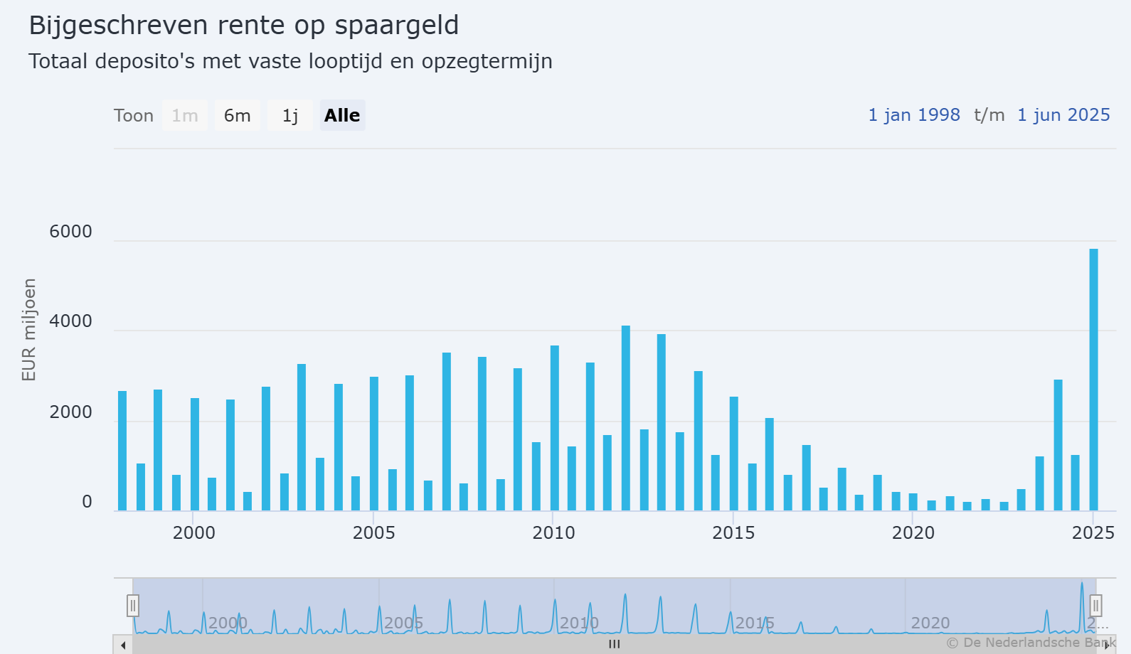 Nederlandse spaarders kregen in de eerste helft van 2025 samen 5,83 miljard euro spaarrente op hun rekening bijgeschreven (bron: DNB). Nooit eerder werd er in Nederland zo’n hoog bedrag aan spaarrente uitgekeerd. Ter vergelijking: in de eerste helft van 2024 werd een bedrag van 2,93 miljard euro aan spaarrente bijgeschreven. Dat bedrag is dit jaar dus verdubbeld.