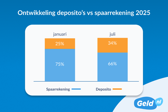 Heb je spaargeld dat je langer kunt missen, dan is het spaardeposito weer een mooi alternatief voor sparen op een spaarrekening. Want waar we in 2024 in de bijzondere situatie zaten dat de spaarrente op vrij opneembare spaarrekeningen hoger lag dan de rente op spaardeposito’s, in 2025 zijn we terug naar de gebruikelijke situatie. En dus is de rente op verschillende spaardeposito’s weer hoger. Daarom kiezen consumenten weer vaker voor sparen op een spaardeposito. Zo steeg het aandeel spaardeposito’s in het afgelopen half jaar van 25% naar 34%.
