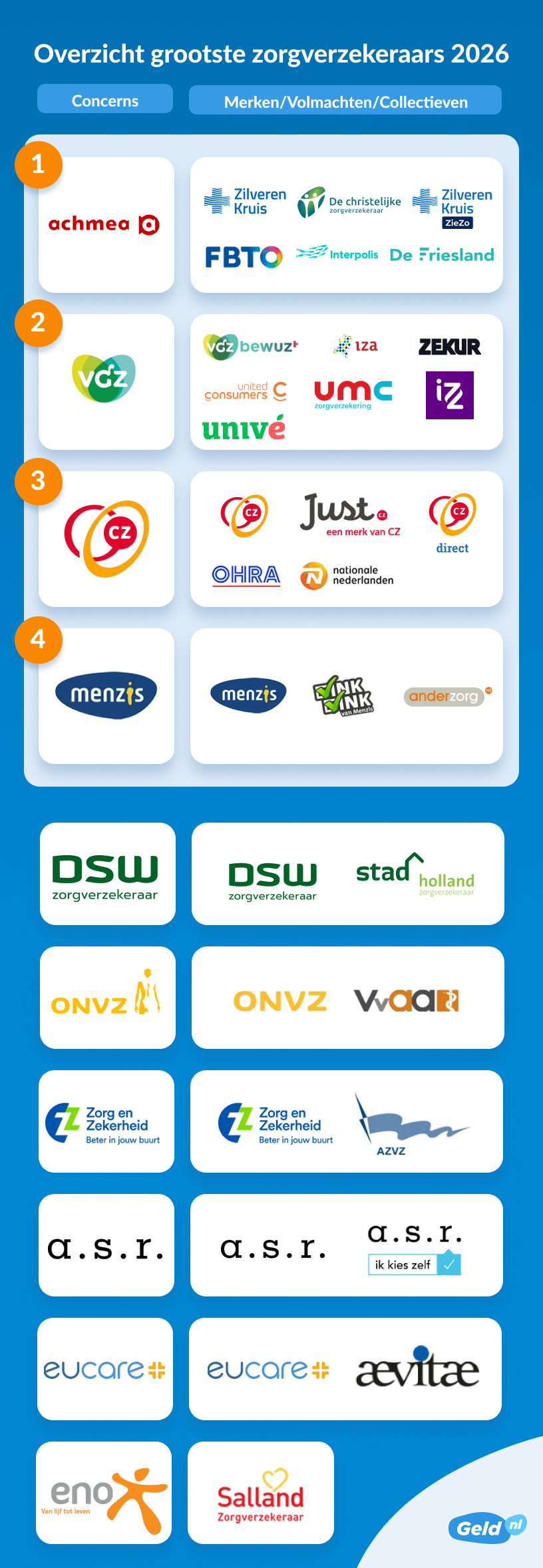 De 4 grootste zorgverzekeraars in Nederland in 2025 zijn Achmea (5,3 miljoen verzekerden), VGZ (4 miljoen verzekerden), CZ (3,8 miljoen verzekerden) en Menzis (1,9 miljoen verzekerden). Veruit de meeste Nederlanders, (bijna 85%), zijn dus bij één van deze vier maatschappijen verzekerd voor hun zorgverzekering. Deze cijfers komen van Vektis, dat elk jaar in kaart brengt bij welke verzekeraars de meeste mensen verzekerd zijn.